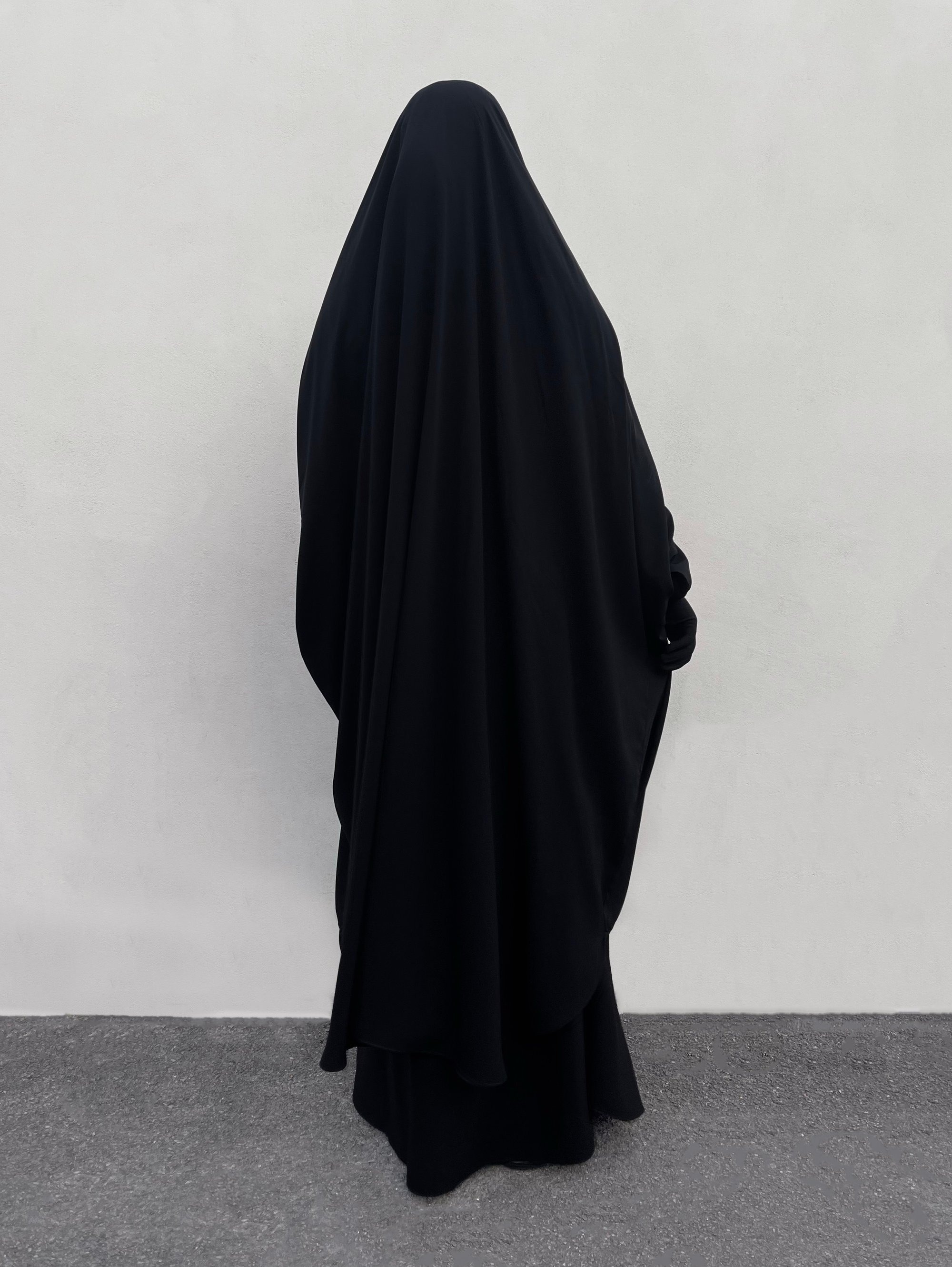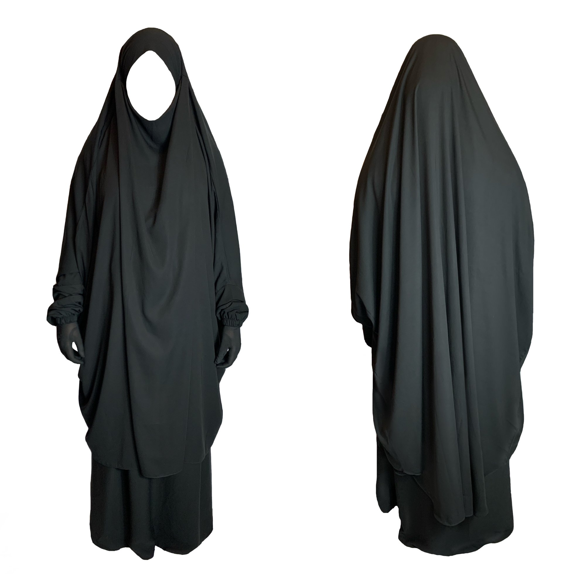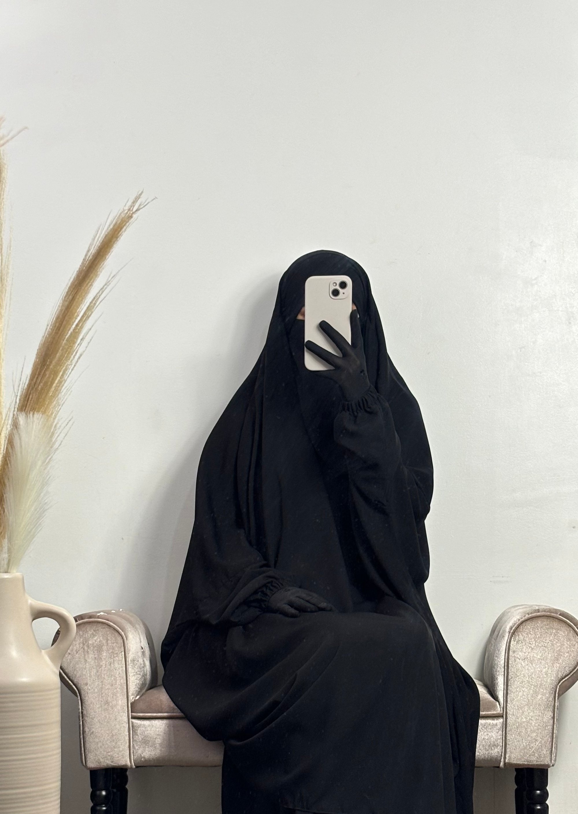 attached niqāb strings, cuffed sleeves with finger loops & elastic waisted skirt with pockets